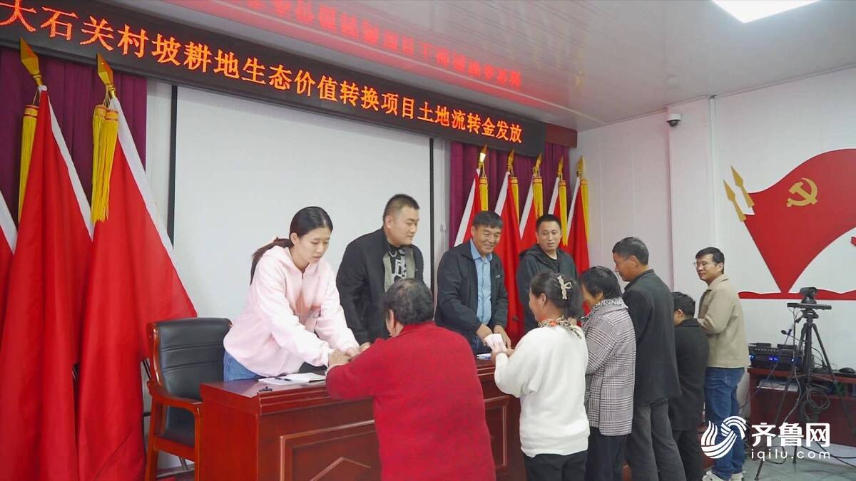 近日,在肥城市老城街道大石关村,一场坡耕地流转金发放活动正在举行。耕地水土保持生态产品价值转化所带来的红利,已经变成实实在在的“生态现金红包”,发放到每一位村民手中。