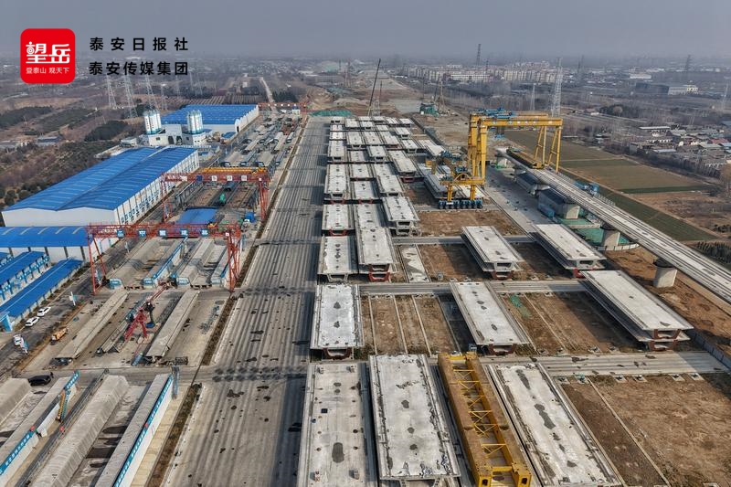 在不远处的中国建筑股份有限公司·泰安制梁场,同样繁忙有序。制梁场承担着796片箱梁的预制任务。截至目前,制梁场已生产160片。节后复工以来,已经有80%工人返岗,生产线全面重启。“今年将全力加快制梁进度,保障26公里线路的梁体供应。”现场负责人表示。